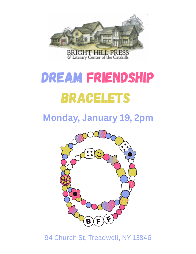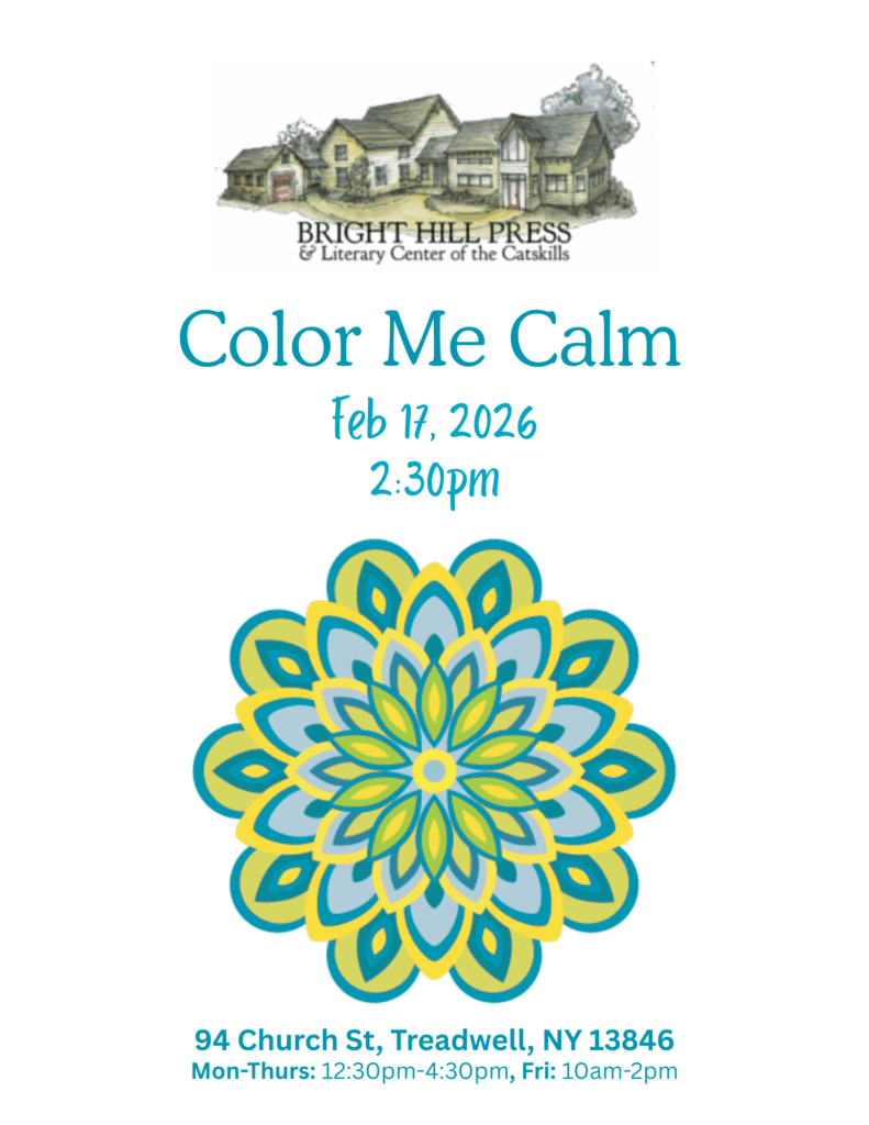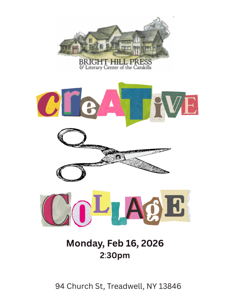 A Special collections library, thousands of volumes of literary journals, prose, poetry, criticism, & biography, theater, reference, art, and children’s books are available for reading & research (parts are non-circulating ). Wireless Internet access is available. Hours are 12:30 PM – 4:30 PM, Monday, Tuesday, Wednesday, Thursday, & Fridays 10 AM – 2 PM. Call 607-829-5055 or e-mail info@brighthillpress.org for further details. Come for a visit and meet our librarians Kathleen Callahan and Amber Mooney.